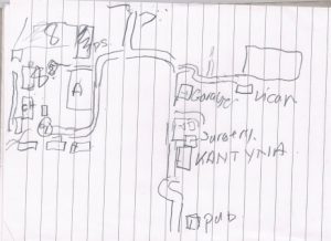 The kantyna was just over the (Red Lion) bridge where you could go and play billiards. It also had their first communal television where the children watched “Bill & Ben”. The doctor’s surgery was behind the kantyna. There was also a big water tower that they used to climb. Moving past the kantyna towards Lower End garage, there were several warehouses (magazyny). There was a road near the warehouses which they were not supposed to use, but they did because it was a short cut to site 12. Near the magazyny there was a pond where you could catch newts.