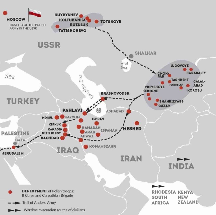 In August 1941 agreement was reached between the Polish government in exile in London and the Soviet Union to free the Poles from Siberia and to allow them to form a Polish army under the leadership of General Anders. The army was initially established in Totskoye to the east of Moscow before moving to Iran via Kazakhstan, Uzbekistan and Turkmenistan. Although they were now free, the Siberian Poles were given little or no travel assistance. They had to make their own way to join Anders’ army, with entire families often walking hundreds of miles.